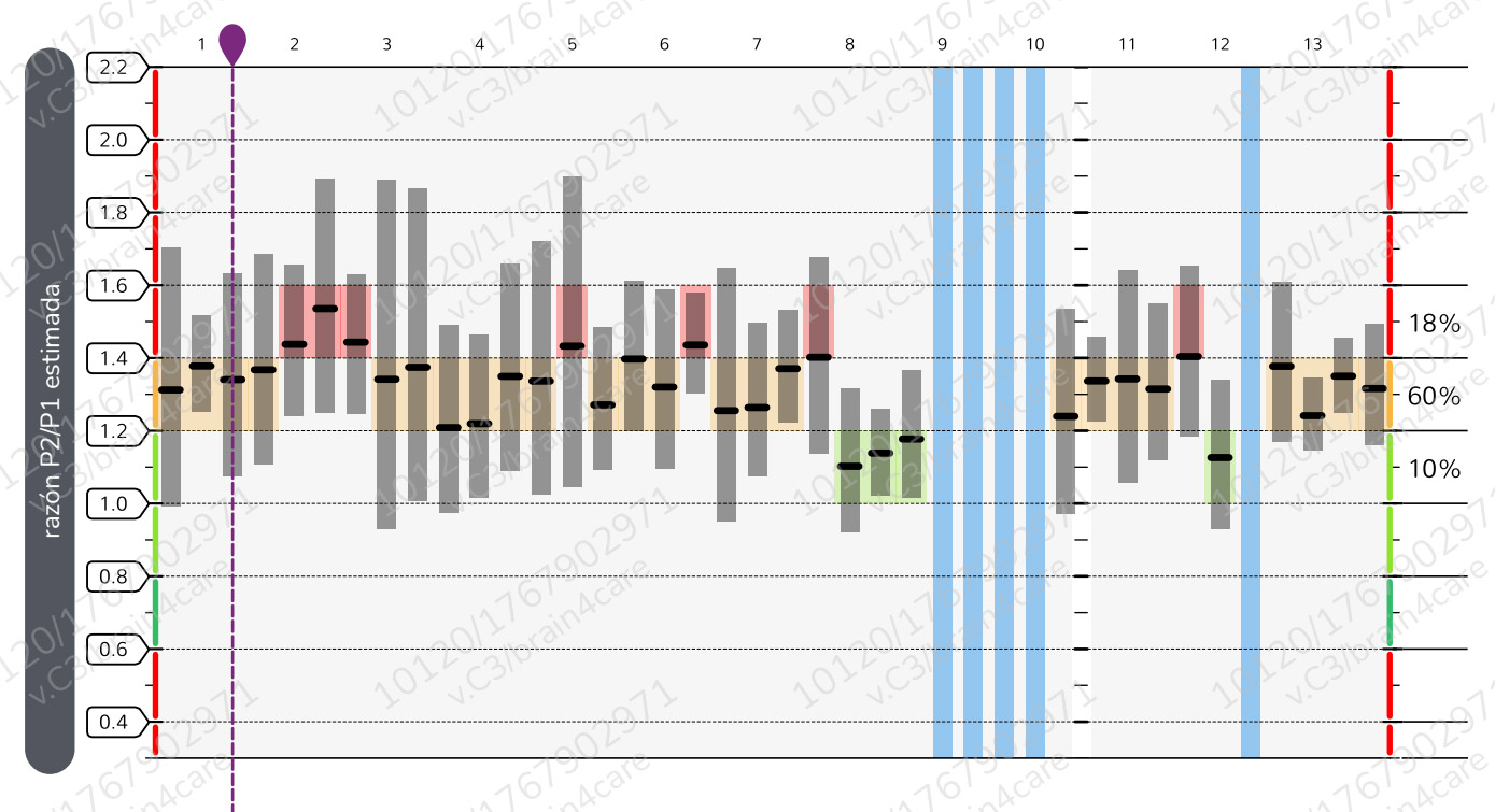 - P2/P1 > 1,4: 90 % de especificidad para evaluar el riesgo de hipertensión intracraneal (HI)*